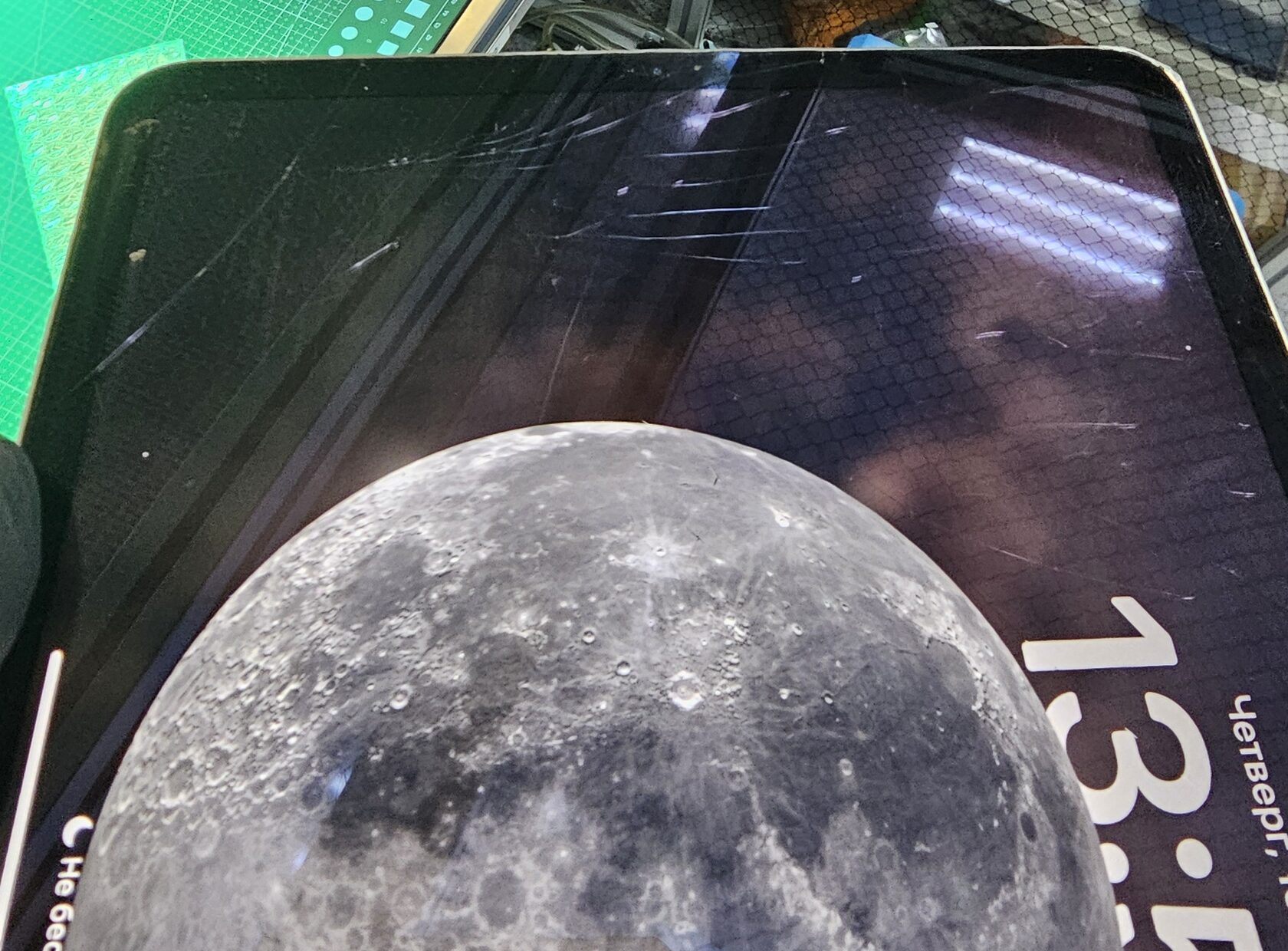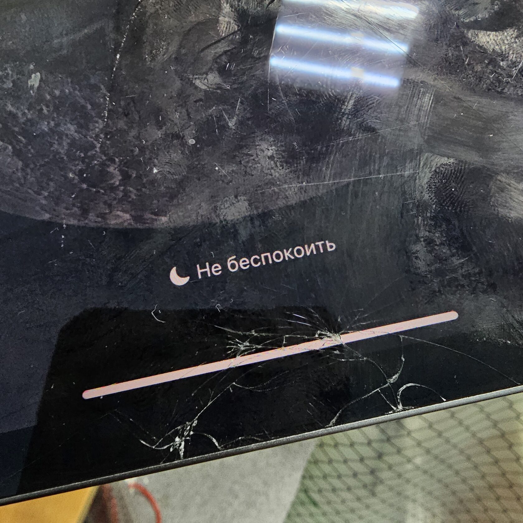 Поступивший на ремонт iPad Pro 11. Несмотря на серьезные трещины, оригинальный дисплей Liquid Retina сохранил полную функциональность, и сенсор работает. Это ключевой момент, который позволяет нам выполнить именно замену стекла iPad Pro 11, а не дорогостоящую замену всего дисплейного модуля.