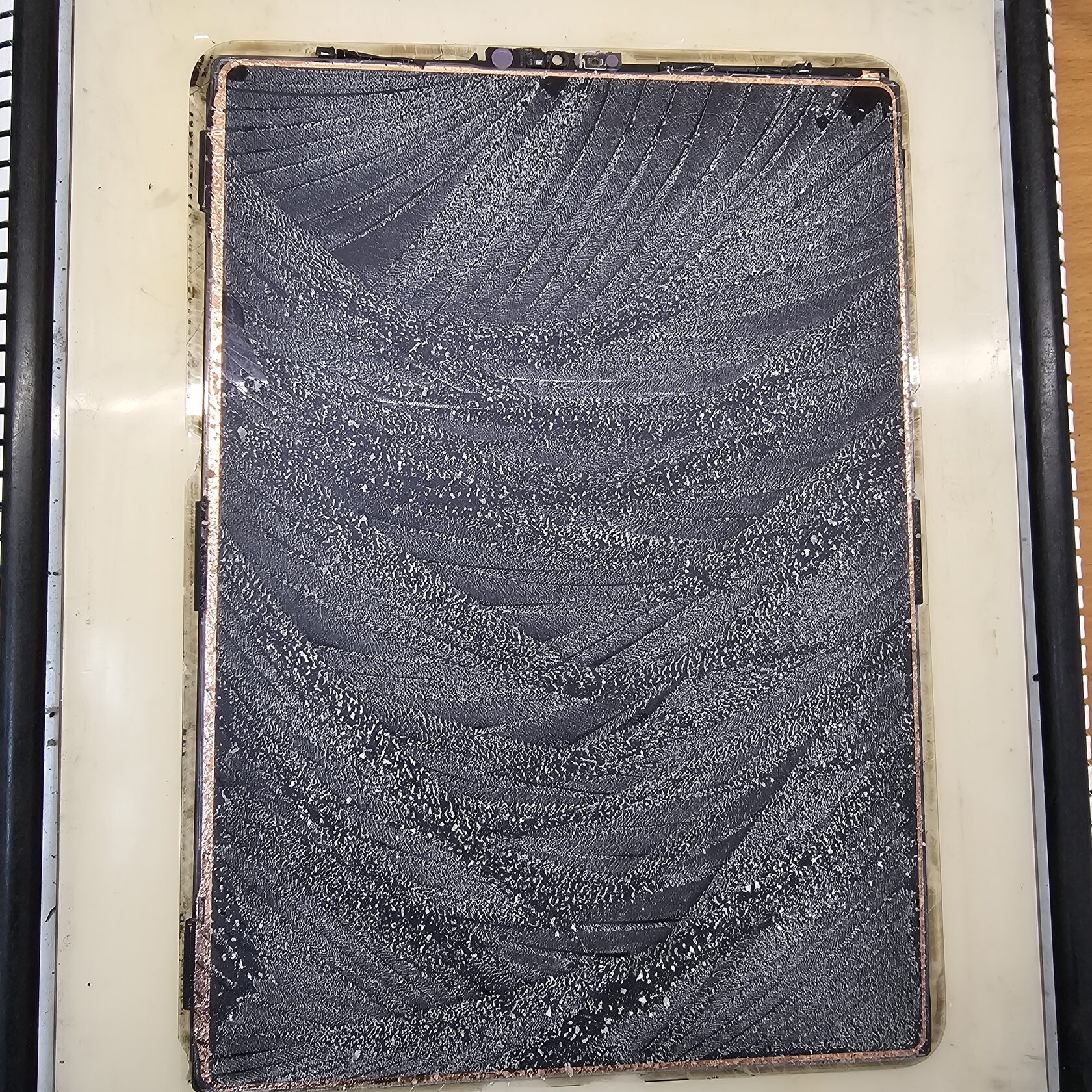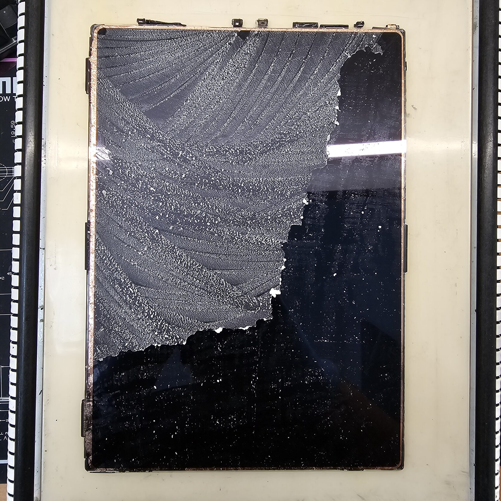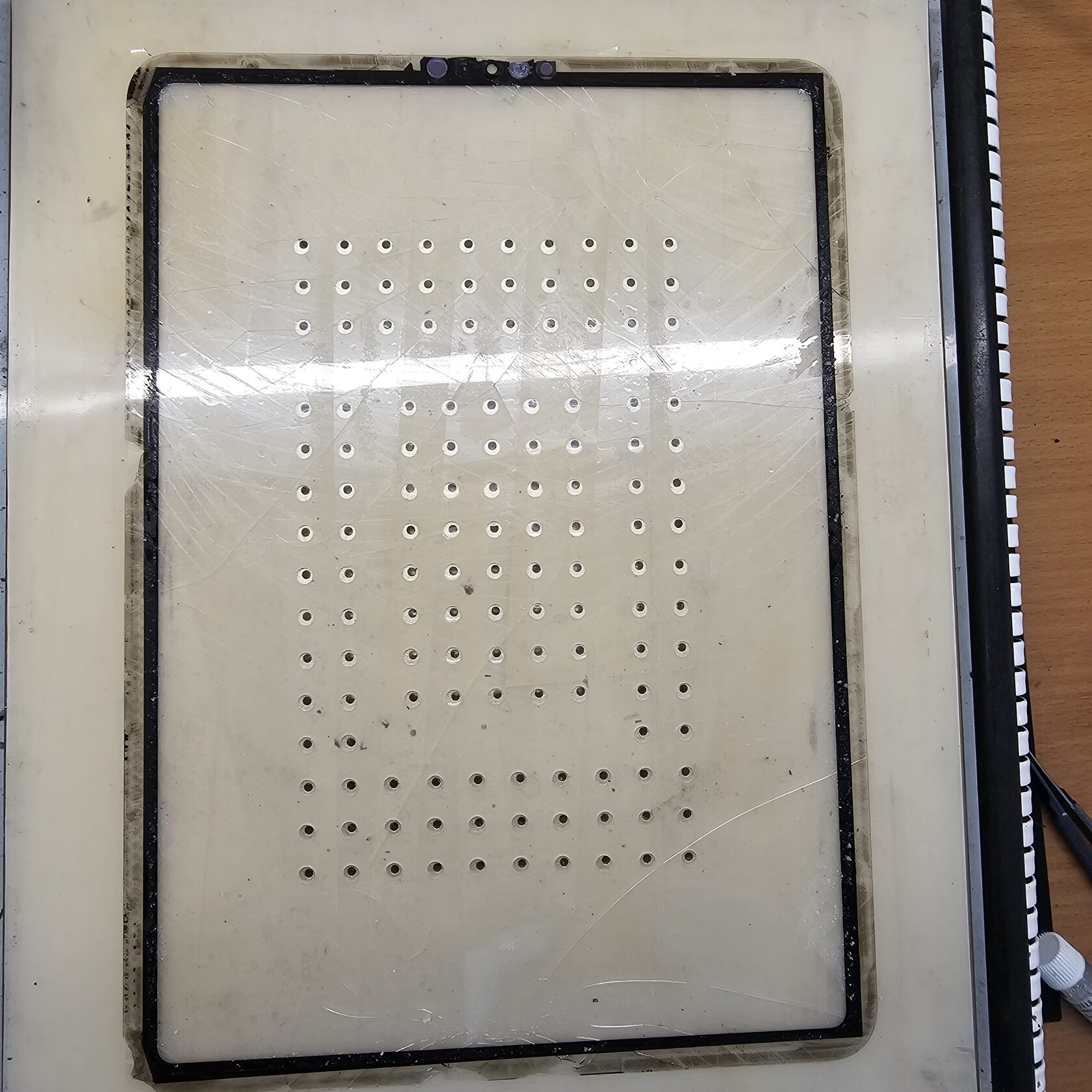 После извлечения дисплей помещается на вакуумный сепаратор. Чтобы предотвратить повреждение матрицы осколками, мы используем специальный фотополимерный состав.