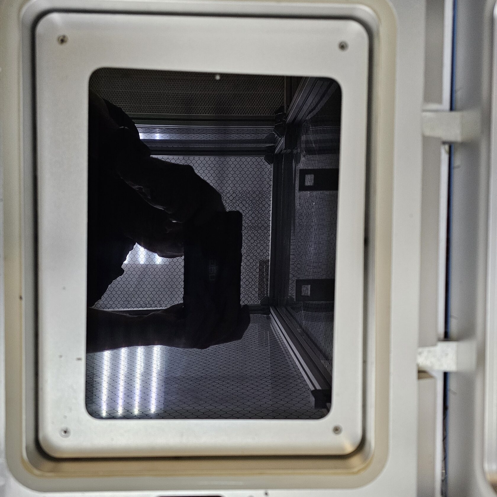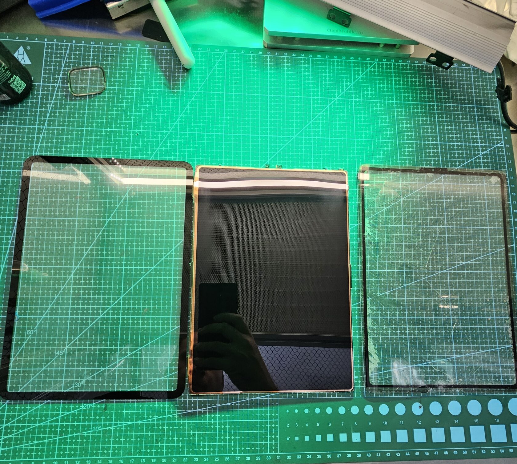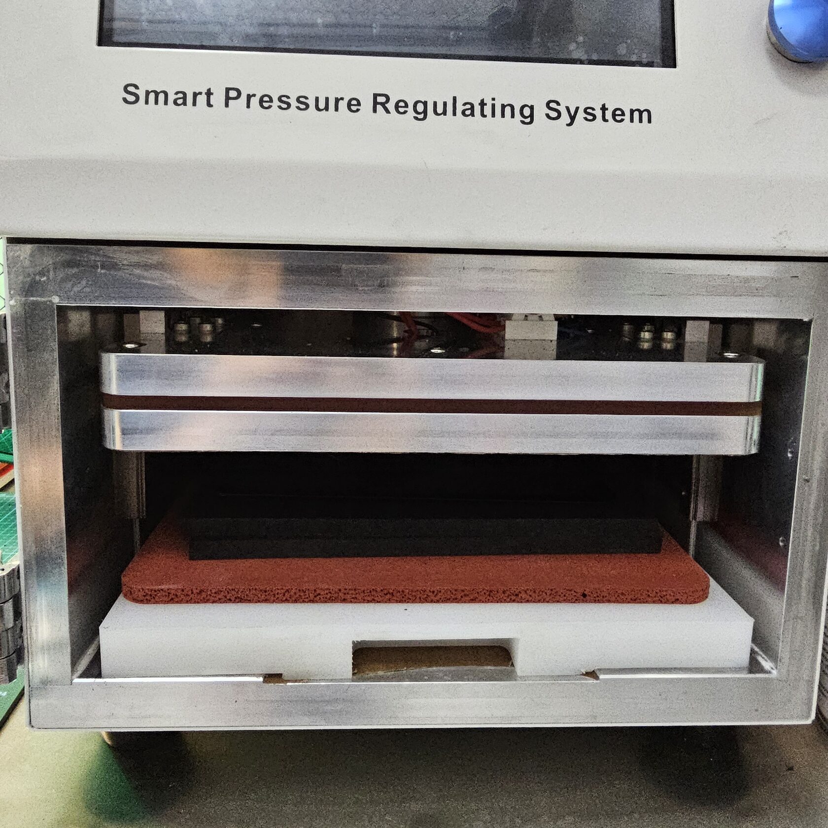 Дисплейный модуль в барокамере,а оператор ,как обычно, в отражении,задача была уложиться в пару часов,не судим строго. Аппарат работает под высоким давлением, выгоняя пузырьки за периметр дисплейного модуля и обеспечивая заводскую прочность склейки.