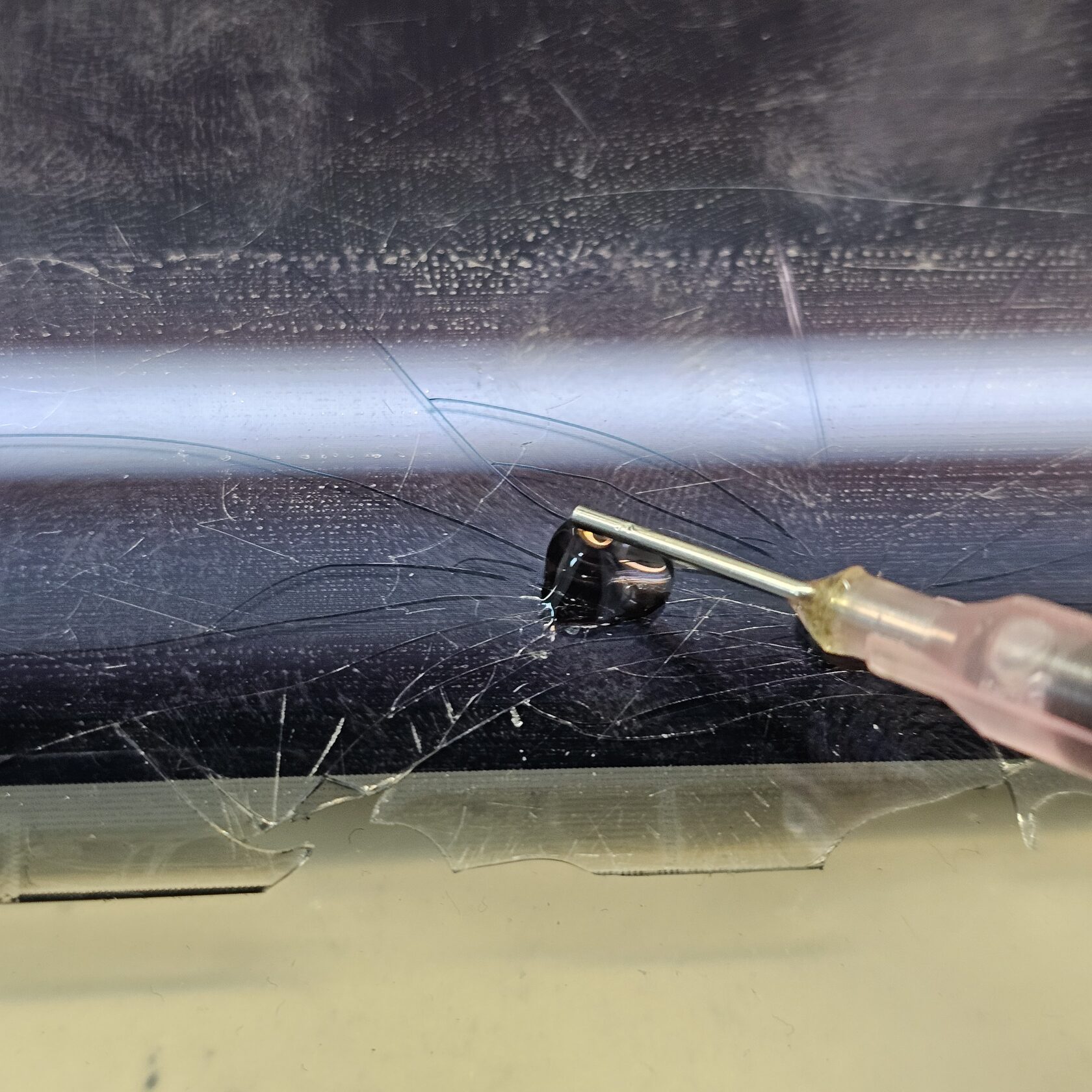 На фото: Заполнение трещин специальным полимером. Состав вводится в места повреждений, а затем отверждается под УФ-светом , делая стекло монолитным и безопасным для сепарации.