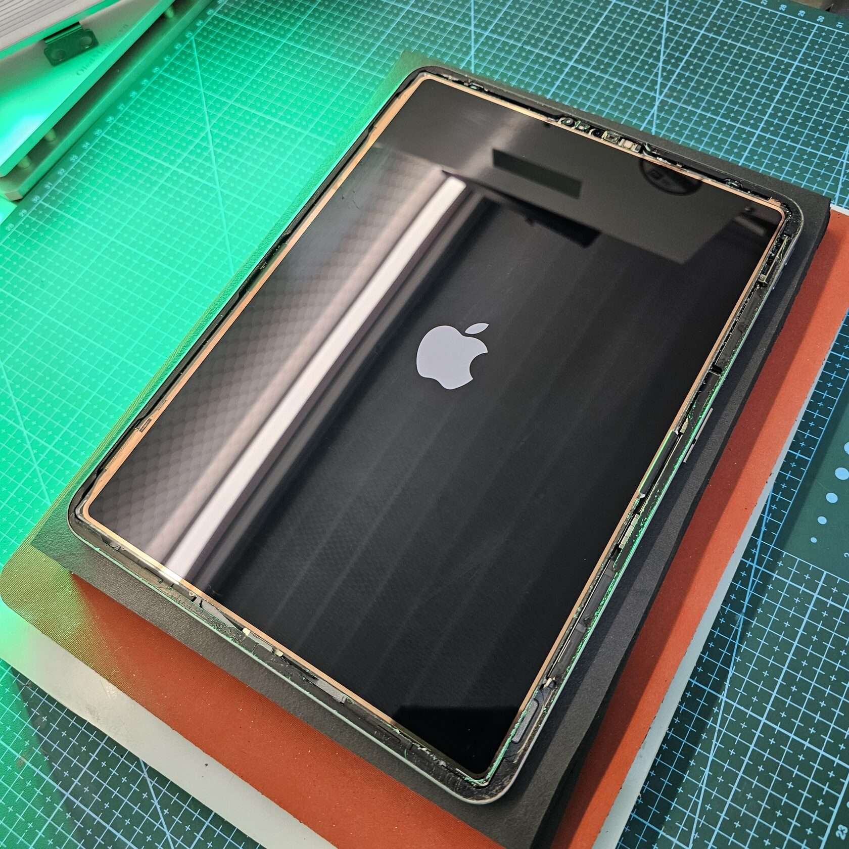 Извлечение дисплейного модуля на iPad Pro 11 — это критически важный этап. Чтобы гарантированно сохранить оригинальный дисплей, мы используем лазерный комплекс для демонтажа.